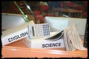 Here’s a couple of closeups. I just covered some library books with white paper and printed out English, Math and Science to make generic textbooks and threw in a couple popular library books along with supplies.