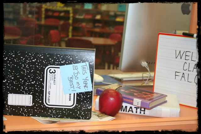 Updated 2016: Same props, different school! I was going to use real pencils to spell out “Back to the Books” on the sign, but die cut pencils were much easier!