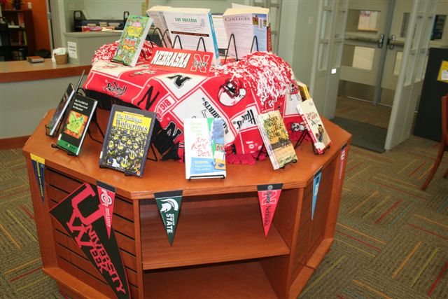 All teachers and staff are encouraged to promote their alma mater through clothing or posters or other material. It was a great excuse to break out my Nebraska Cornhusker props! Blankets, pendants, helmets, and pom poms were great accessories for this display.
