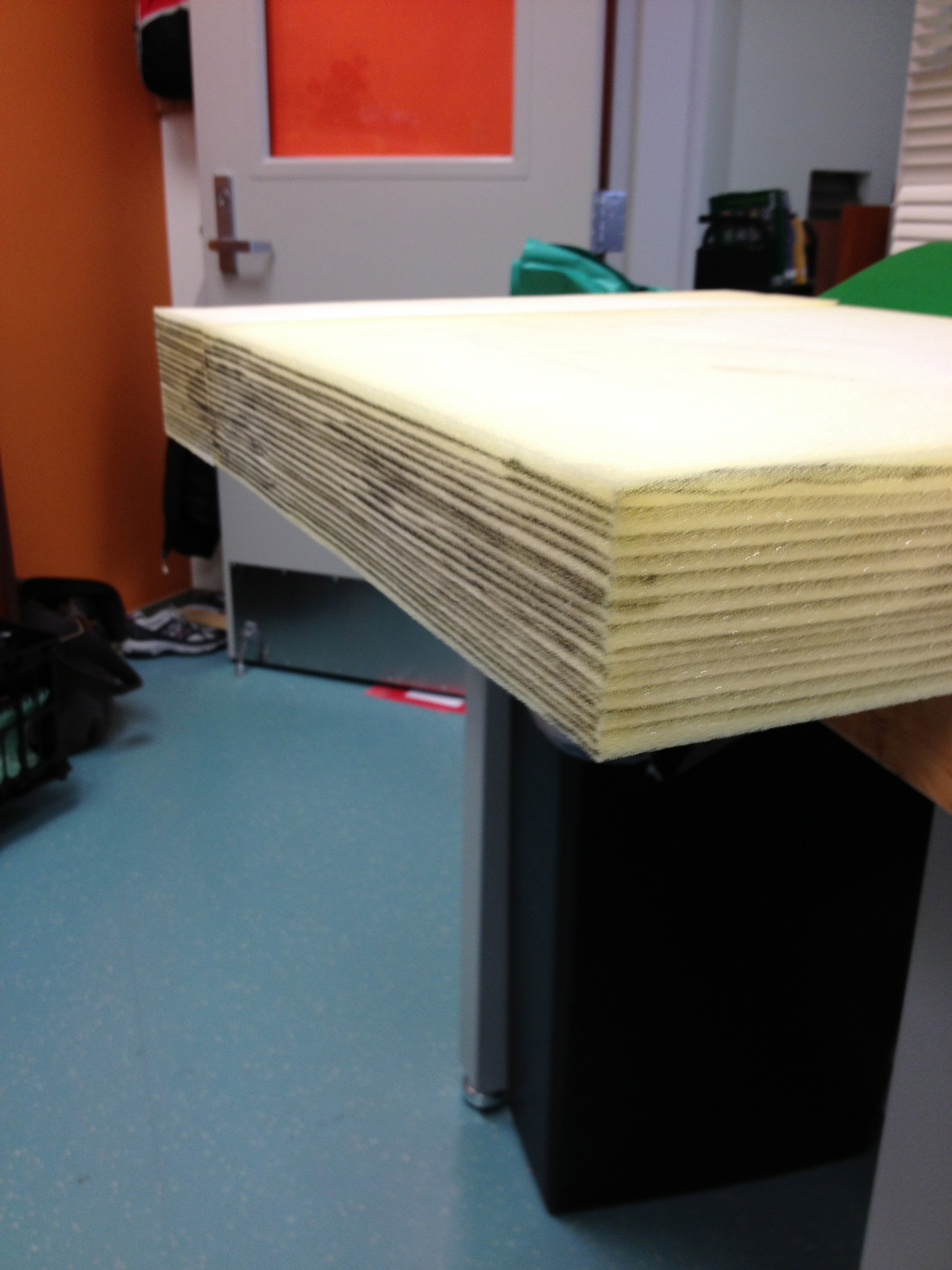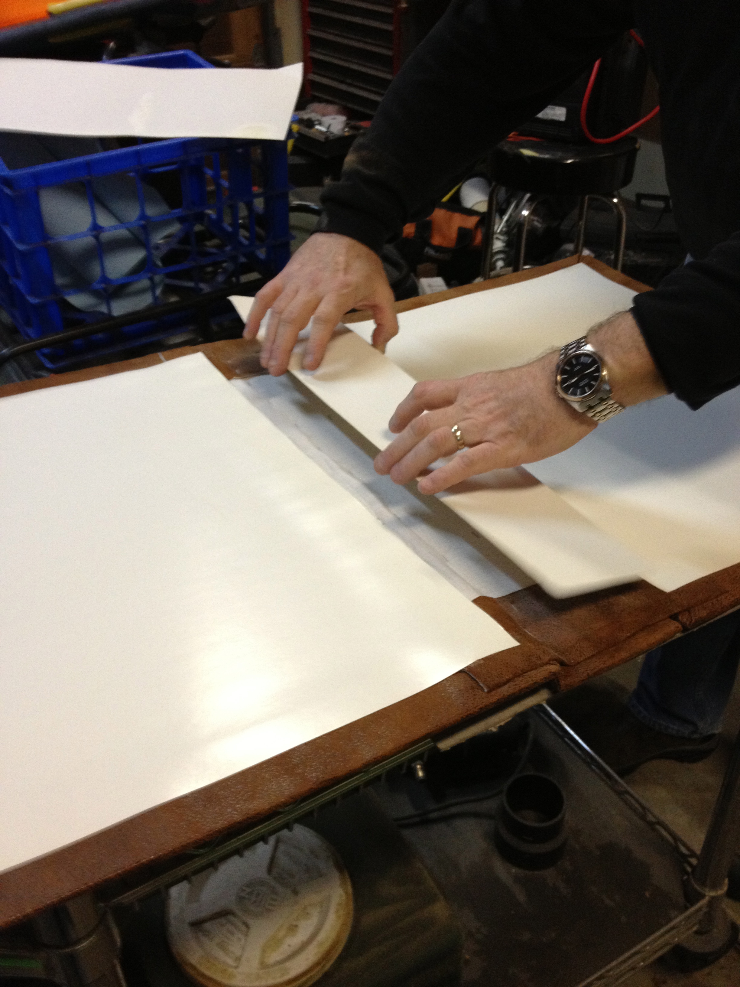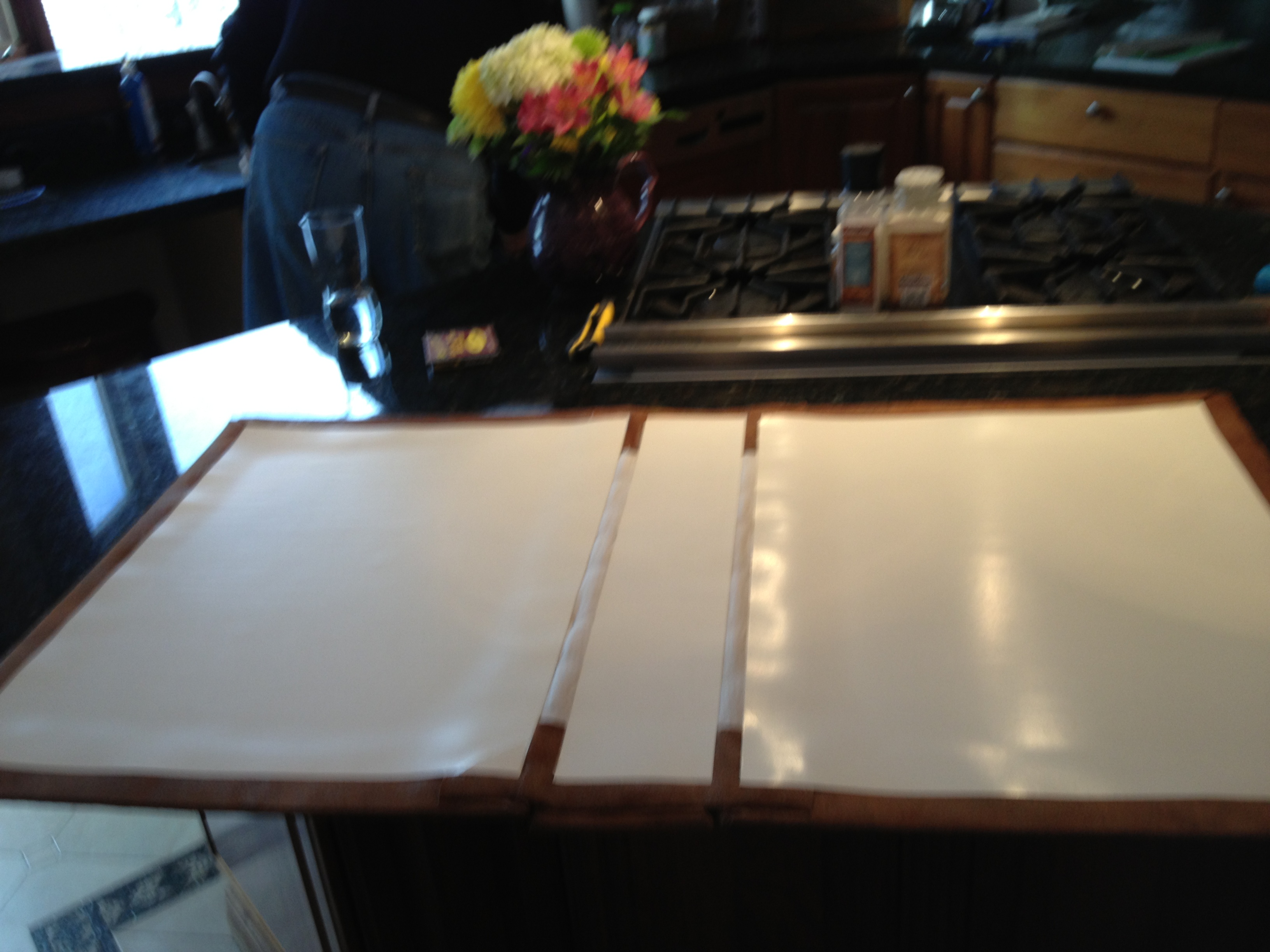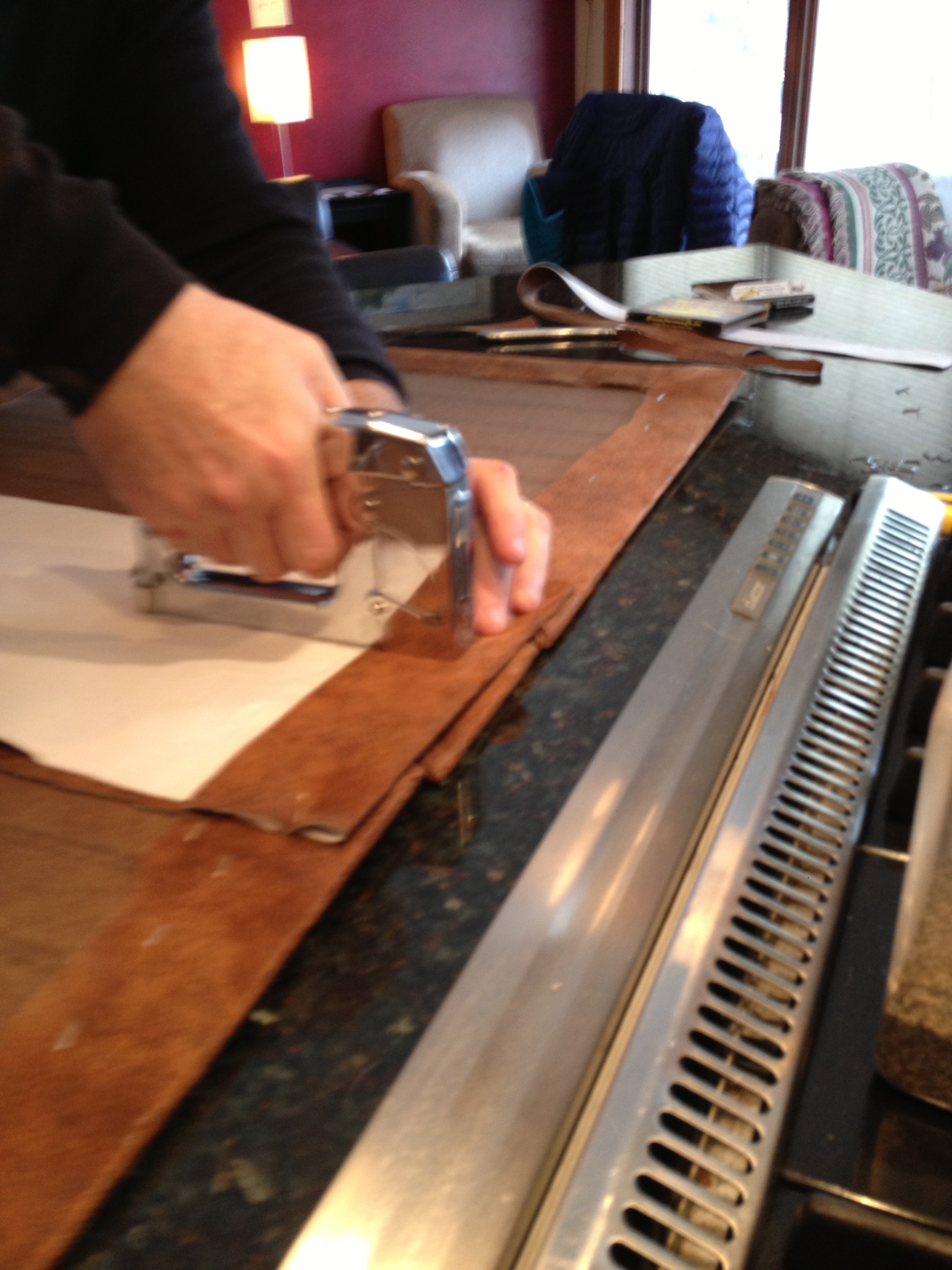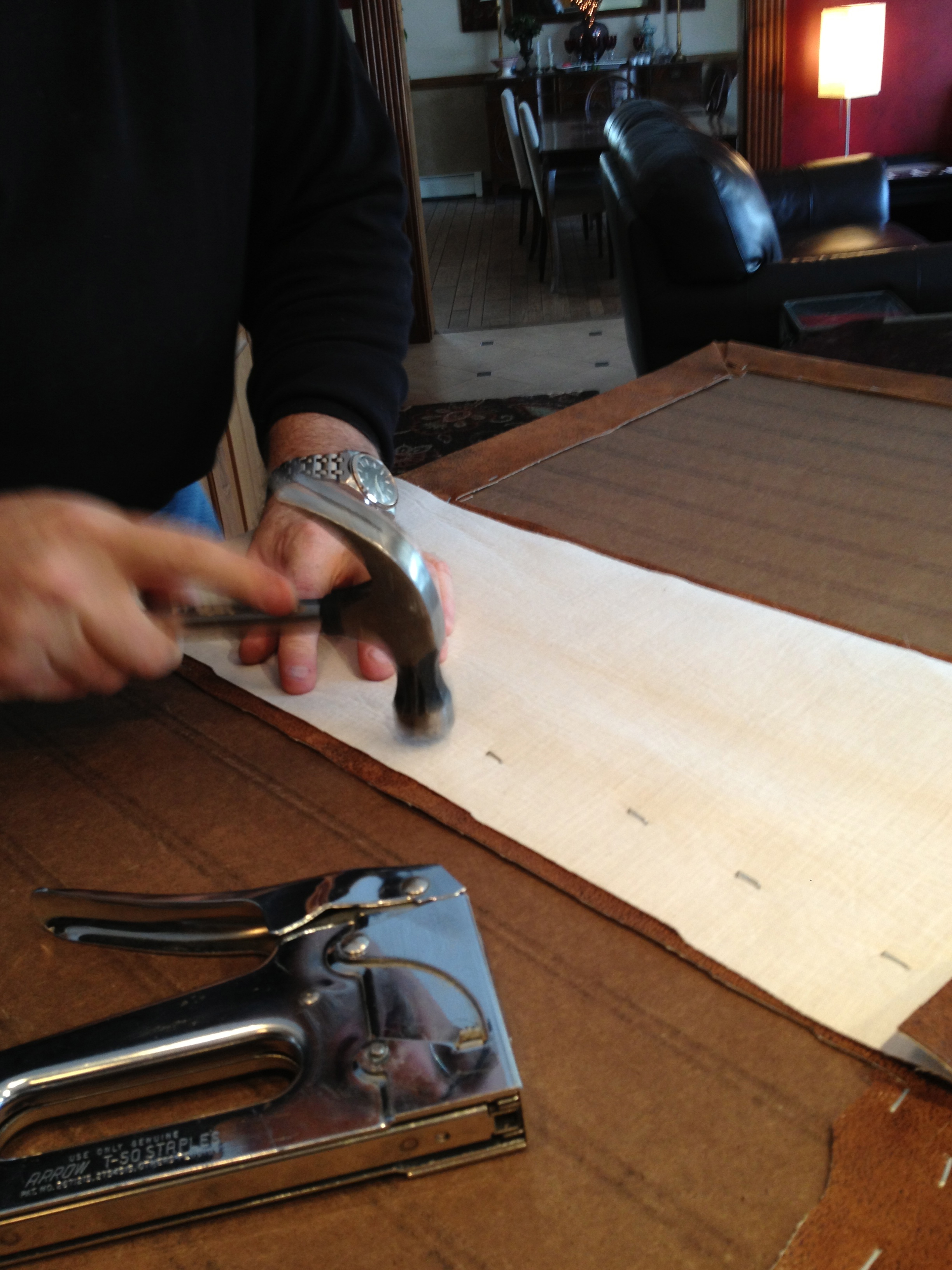IMG_3211IMG_3215IMG_3214Lay the three pieces together then place another piece of fabric, right side down and slightly longer that the length, to span across all three pieces. Attach with staples, and fold down the top and bottom edges where the right side of fabric will be seen. Next, it’s time to cover the wood, and staples with a nice clean piece of poster board. We used a spray clue to stick to the wood and leather. Time to move into the garage for that.