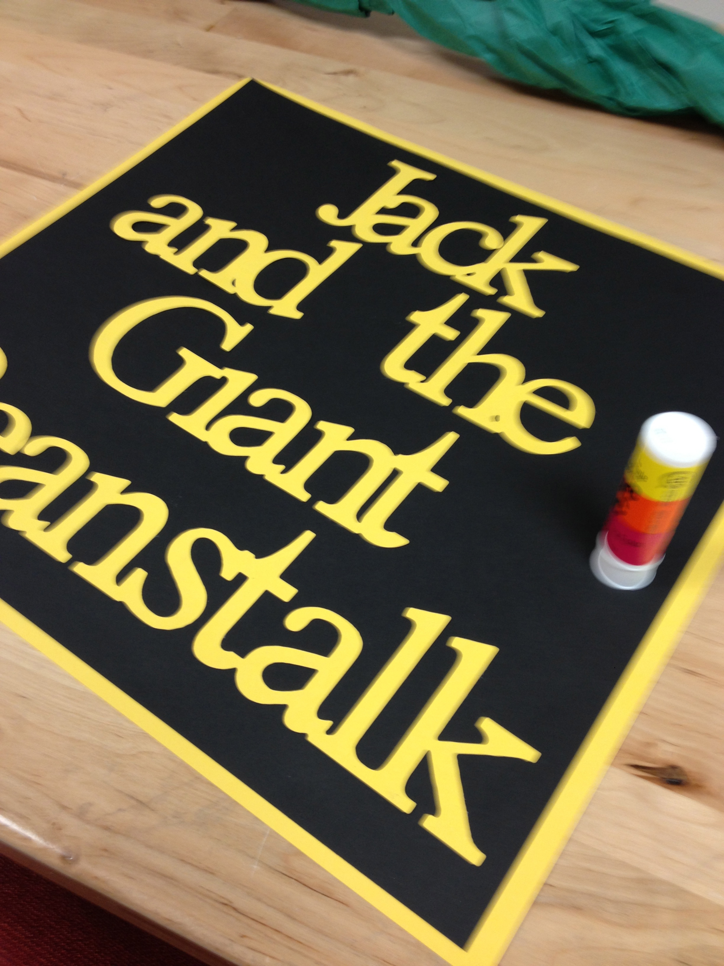 IMG_3233IMG_5854The beanstalk was easy. Just twisted up some long sheets of green paper, cut out some leaves (I laminated them to keep them from ripping), taped them, and then taped the stock up to the ceiling.