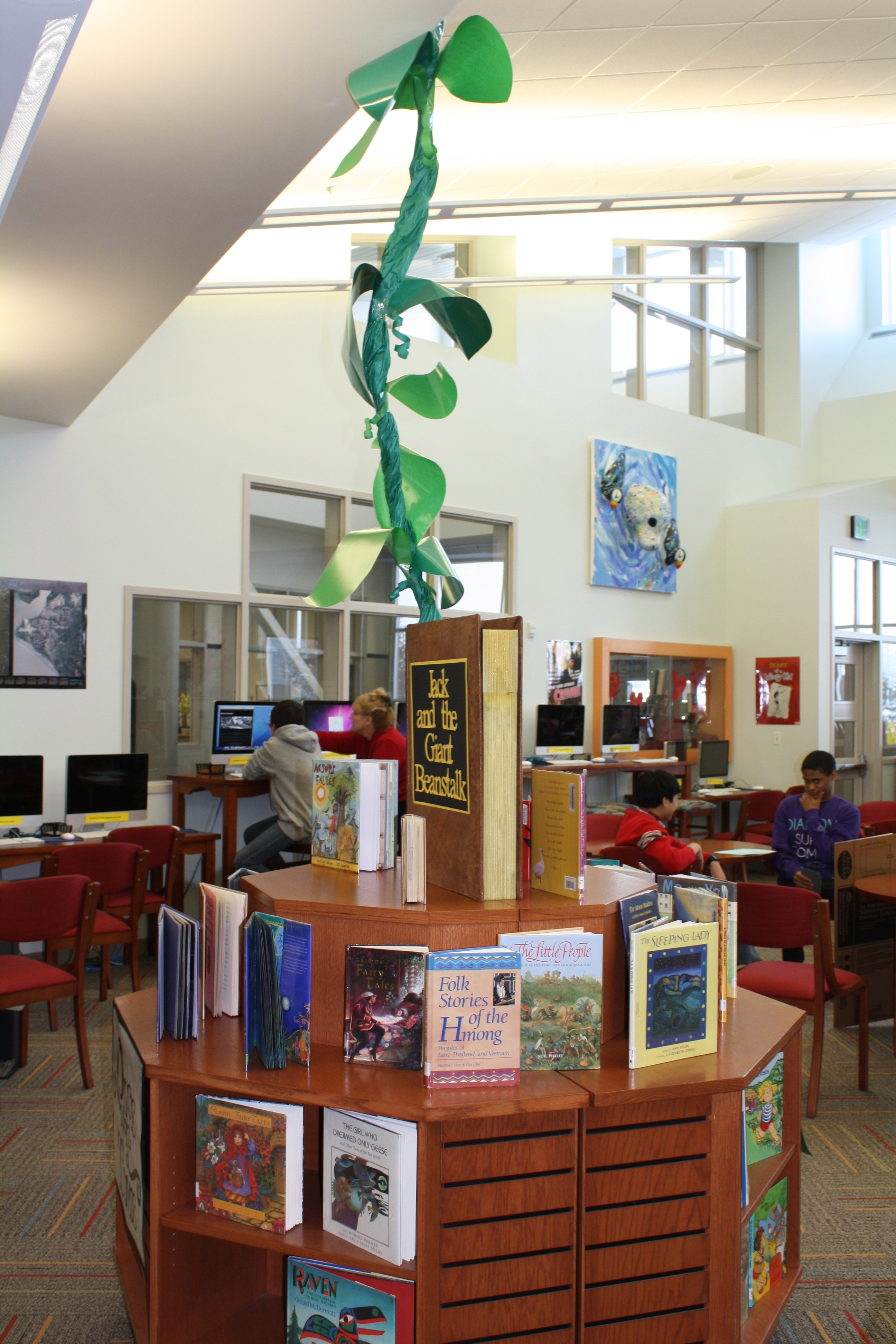 Fairy Tales are a neglected genre in our library. With the movie based on Jack and the Beanstalk coming out, it seemed like a perfect time to feature them. Plus, my library assistant was ready to try out an idea that had been rambling around in her mind for a while – making a giant fake book with a giant beanstalk growing out of its pages up to the ceiling.